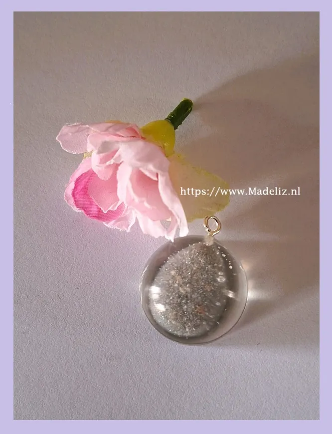 De hanger is rond en gedeeltelijk transparant met het as in druppelvorm,
