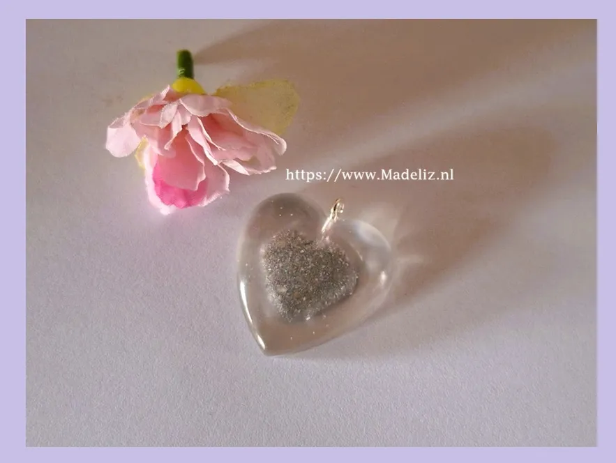 De hanger is hartvormig en gedeeltelijk transparant,