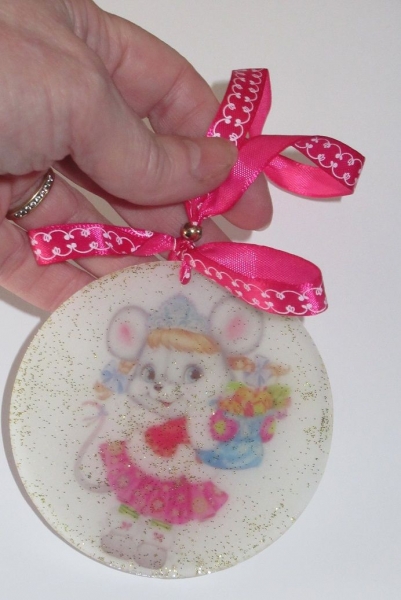 Het ronde ornament is 10cm groot, samen met het lint is hij ca 17/18 cm lang