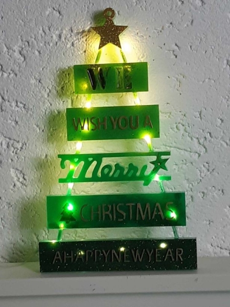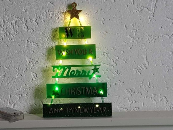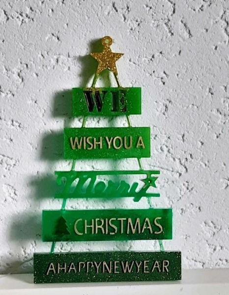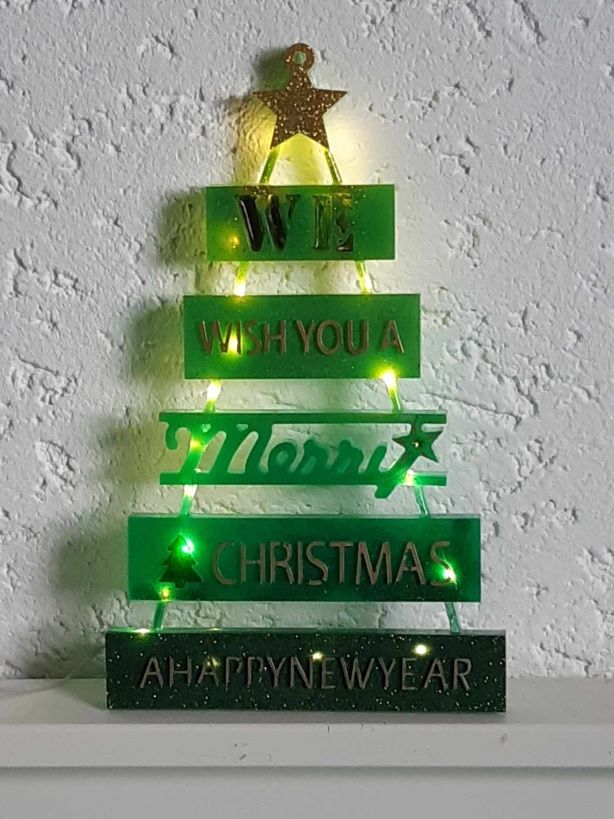 Super leuke kerstboom met gouden letters, leuk om op te hangen maar hij kan ook staand tegen een muur.