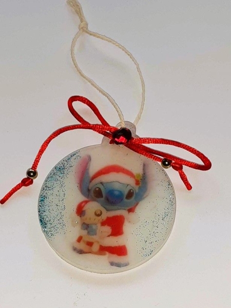 Het ronde ornament is 10cm groot, samen met het lint is hij ca 17/18 cm lang