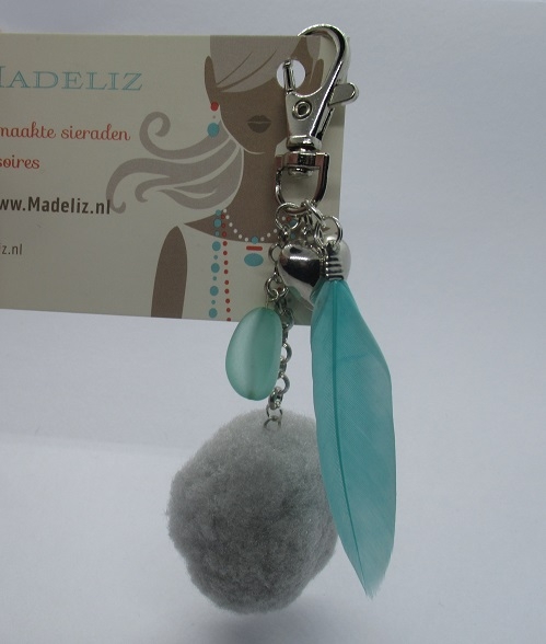 Prachtige tashanger met mooie grote grijze pompon, een mint kleurige veer en steentje en een zilver kleurig hart.